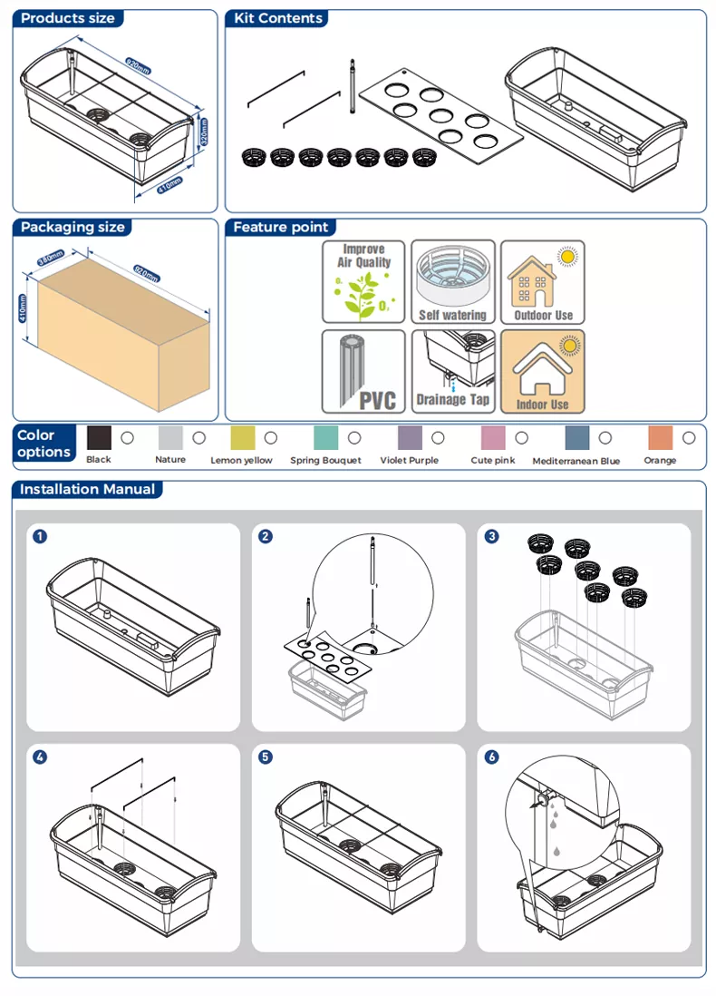 هذا المسوي ذاتي السقاية بسعة 30 لتر مناسب لزراعة الخضروات والنباتات الخضراء والزهور. وهي مجهزة بمقياس لمستوى المياه لمراقبة مستوى المياه. عندما يتجاوز مستوى الماء الحد الأقصى، تحتاج إلى تصريف الماء من الوعاء. يوجد صمام تصريف على جانب الوعاء. ادفعه إلى الداخل لإغلاقه واسحبه إلى الخارج لتصريف الماء. يمكن استخدام هذا الوعاء في الداخل والخارج. عند استخدامه في الهواء الطلق، تأكد من فتح صمام الصرف لمنع تراكم الماء في الوعاء بسبب المطر.