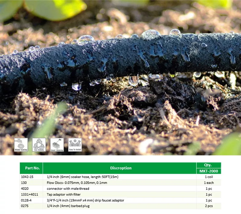 DIY طقم خرطوم معتاد على الثمالة MKT-2000 1، يمكنك بسهولة إنشاء سقي فعال ومريح نظام لحديقتك 2، خرطوم معتاد على الثمالة يحافظ على ما يصل إلى 70% من الماء، مما يوفر لك المال والمساعدة في الحفاظ على مواردنا الطبيعية 3، تحتوي على كل ما تحتاجه لإعداد خرطوم ري معتاد على الثمالة نظام