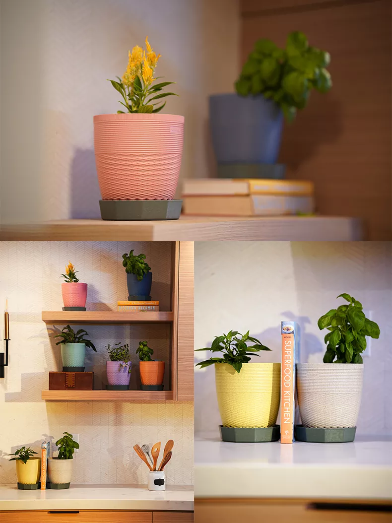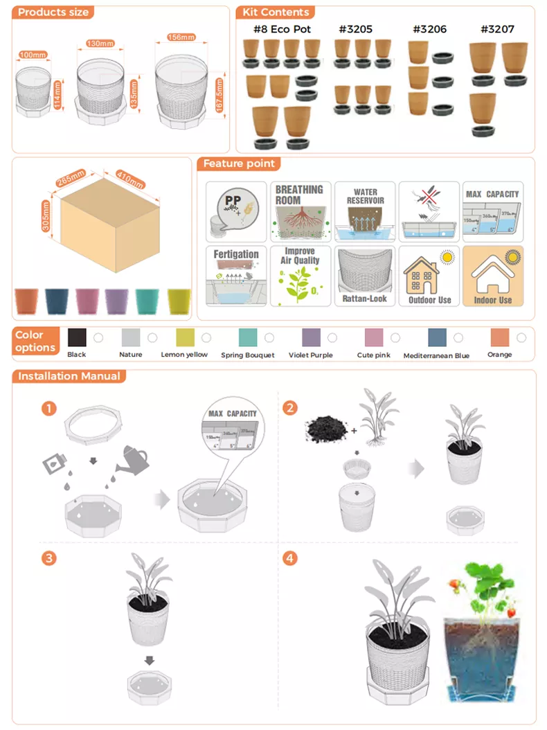 هناك ثلاثة أواني زهور بأحجام مختلفة في هذه السلسلة. إناء الزهور مقاس 4 بوصات هو الأصغر، والأصيص مقاس 5 بوصات متوسط الحجم، والأصيص مقاس 6 بوصات هو الأكبر. يأتي كل وعاء زهور مزودًا بقاعدة لتخزين الماء.