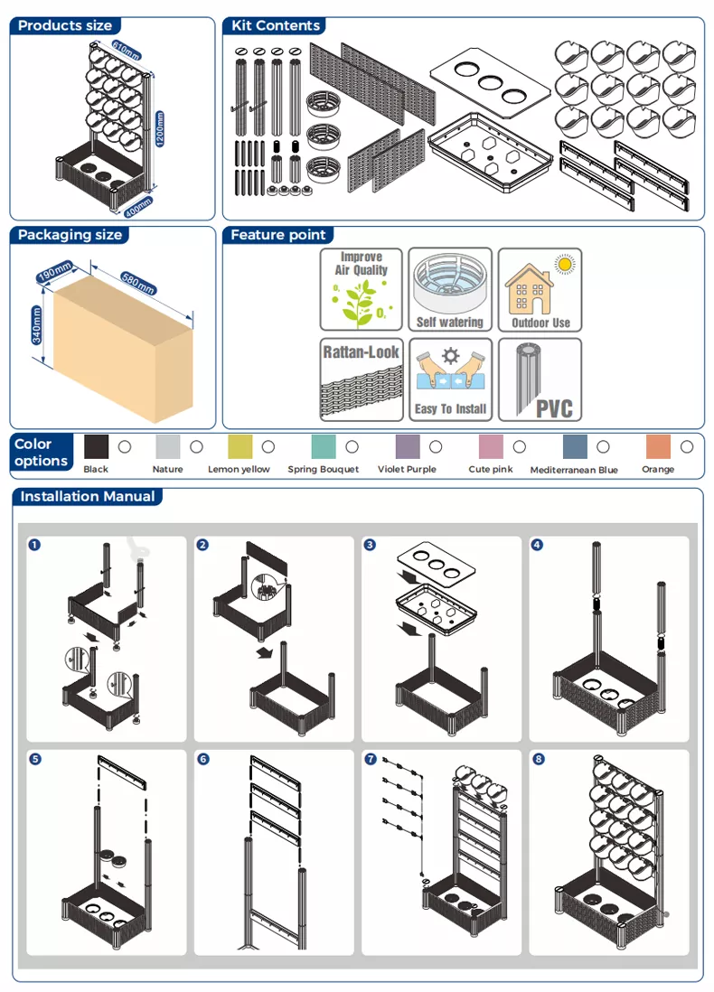 61*40*102 سم (الطول*العرض*الارتفاع) جدار أخضر داخلي قائم بذاته مع 12 قطعة × #1 وعاء (13.7 × 16.5 × 12.5 سم)، 3 قطع × 4 بوصات، صينية شعرية ذاتية السقي