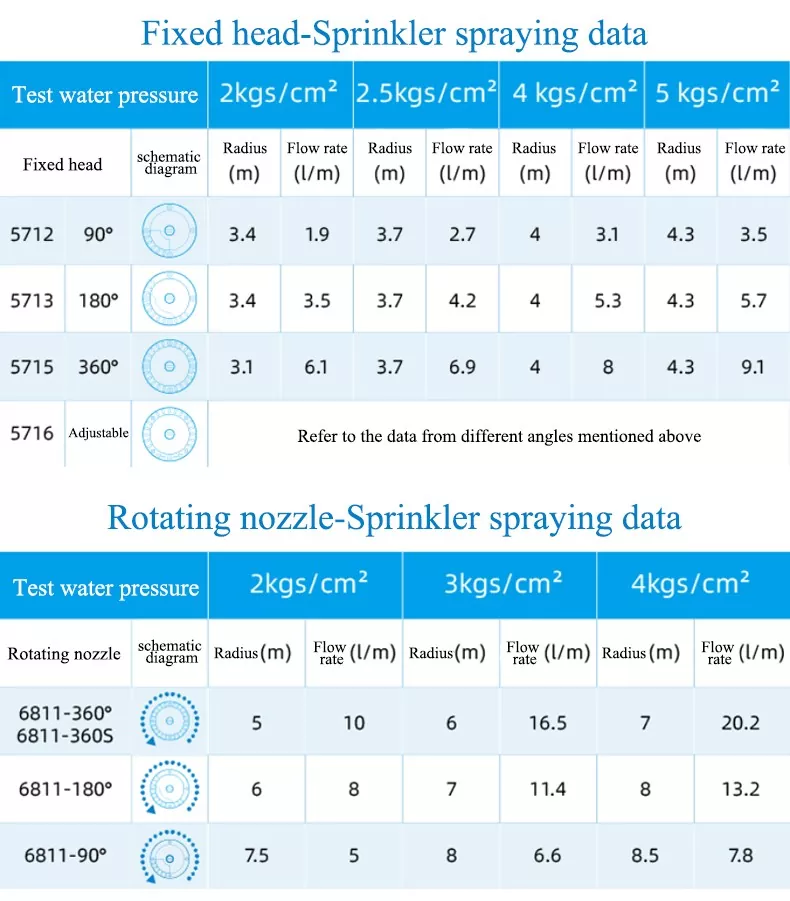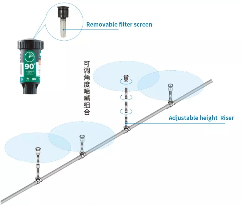 تغطي منتجاتنا نوعين من الرشاشات: الدوارة والثابتة. توفر كل من الرشاشات الدوارة والثابتة خيارات زاوية مثل 90 درجة و180 درجة و360 درجة، مقترنة برشاشات داخلية زاوية قابلة للتخصيص، ويمكنها تلبية احتياجات سيناريوهات الري المختلفة بدءًا من المناطق الثابتة وحتى التعديلات المرنة، ومن مناطق الزوايا الصغيرة إلى المساحات الكبيرة بأكملها، دون الحاجة إلى شراء معدات إضافية.