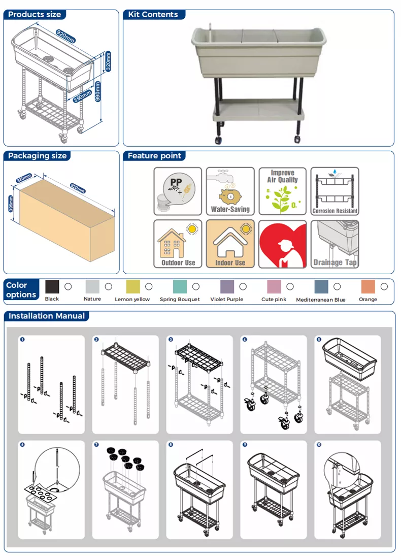 يتوافق سرير الحديقة المرتفع المتنقل مع مبادئ التصميم المريح، وخاصة العناية الجيدة بكبار السن الذين يجدون صعوبة في الجلوس في وضع القرفصاء بسبب مشاكل الحركة. بفضل تصميم رف التخزين ذو الطبقة الواحدة، يمكنه تخزين جميع أنواع الأدوات والملحقات اللازمة لزراعة الزهور والنباتات. وهي مجهزة بعجلات عالمية، مما يسهل حركتها في البيئات الداخلية والخارجية. يمكن أن تلبي احتياجات الأشخاص الذين يعيشون في المدن والذين يحبون الزراعة. فهو يوفر لك بيئة ممتازة لزراعة النباتات ويساعدك بسهولة على إنشاء نمط حياتك البيئي والأخضر والصحي.