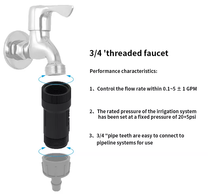 منظم الضغط مناسب لأنظمة الري الداخلية والخارجية مقاس 13 مم/19 مم/25 مم، وتتمثل وظيفته الأساسية في تثبيت ضغط المياه وتدفقها من خلال تنظيم ضغوط المدخل المختلفة، مما يضمن إنتاجًا ثابتًا للري بالتنقيط عند نقطة النهاية، وأنظمة الرش، وغيرها من تطبيقات الري منخفضة التدفق. وهو متوافق مع جميع أنواع الري بالتنقيط، وأنظمة التدفق المنخفض، وآلات الرش المتنقلة، مما يجعله مثاليًا لإعدادات الري الموفرة للمياه.