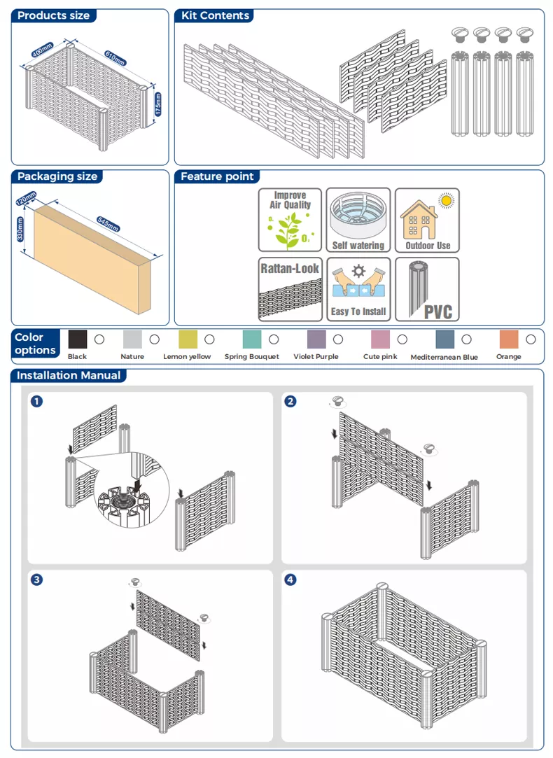 يأتي كل سرير حديقة بلاستيكي مستطيل الشكل مزودًا بدليل تعليمات تجميعي مصور ومفصل، يوضح بوضوح خطوات التثبيت والاحتياطات لكل مكون. إذا واجهت أي أسئلة أثناء عملية التجميع، يمكنك الاتصال بنا في أي وقت من خلال خدمة العملاء عبر الإنترنت أو الخط الساخن الرسمي أو القنوات الأخرى، وسنقدم لك إرشادات فيديو أو نصية فردية لضمان إكمال التثبيت بسلاسة.