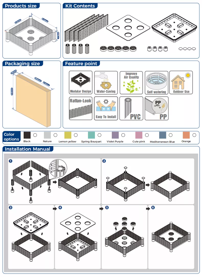 المواد والحرفية: سرير الحديقة البلاستيكي الروطان المقلد المربع مصنوع من بلاستيك PP/PE عالي الجودة بحرفية فائقة. تلبي المنتجات شهادات الجودة الخاصة بالاتحاد الأوروبي/الولايات المتحدة لأسواق التصدير.