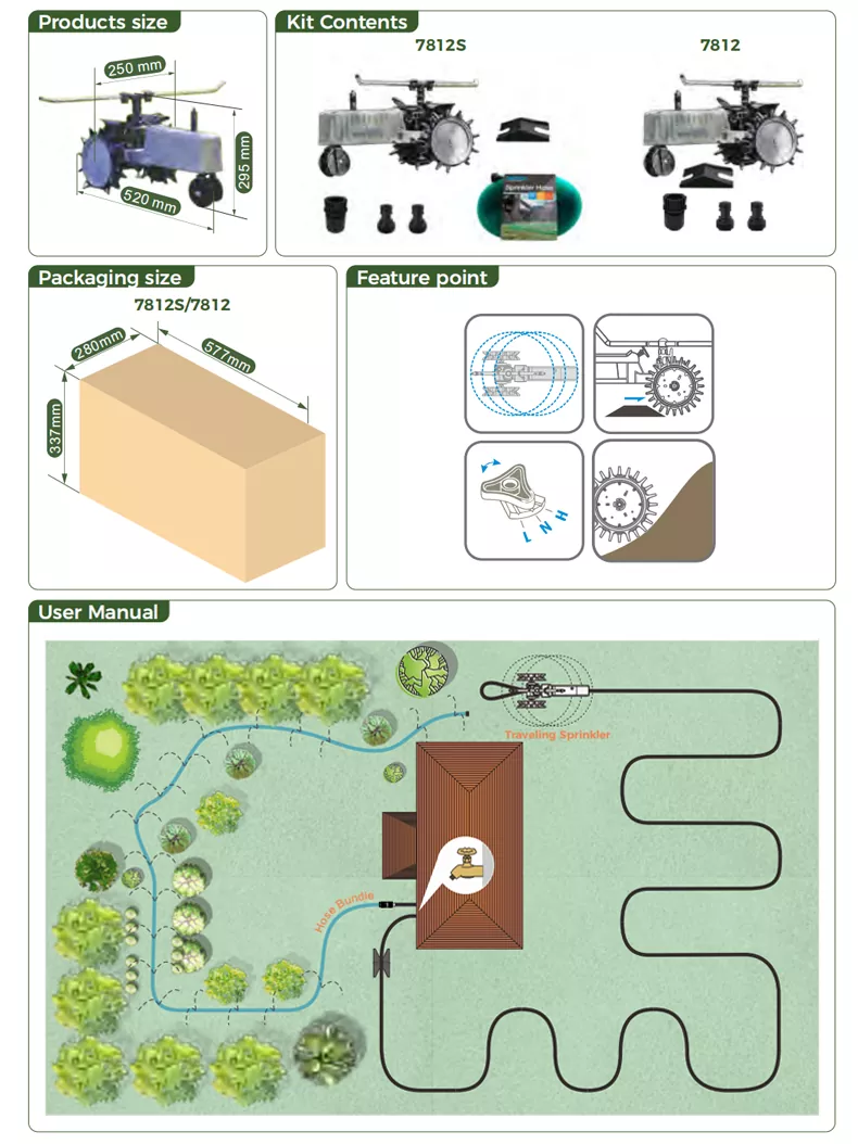 باعتبارها عجلة مائية ذاتية الدفع، فإن Travelling Sprinkler خالية تمامًا من الاعتماد على الكهرباء أو البطاريات ويتم تشغيلها عن طريق ضغط ماء الصنبور للتحرك ورش الماء، وهذا لا يزيل مشكلة شحن البطاريات أو استبدالها فحسب، بل يحقق أيضًا الحفاظ على الطاقة وحماية البيئة من المصدر. وعلى المدى الطويل، يمكن أيضًا تقليل نفقات استهلاك الطاقة الإضافية، وهو ما يتماشى مع مفهوم الحياة الخضراء.